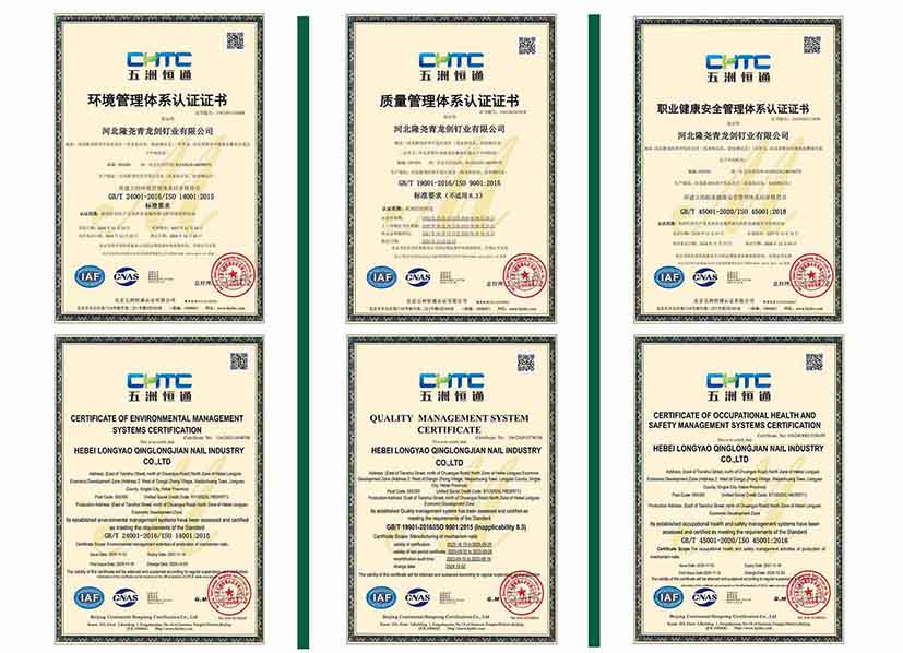 公司始終以“讓勞動(dòng)創(chuàng)造更多價(jià)值”為企業(yè)理念,致力于生產(chǎn)優(yōu)質(zhì)高效的釘類產(chǎn)品。本次通過科學(xué)的管理體系和方法,不斷提升產(chǎn)品質(zhì)量與服務(wù)水平。此次公司通過了多項(xiàng)體系認(rèn)證,標(biāo)志著青龍劍公司一直保持符合國(guó)際標(biāo)準(zhǔn)化的管理體系要求,進(jìn)一步鞏固了青龍劍在行業(yè)中的領(lǐng)先地位。