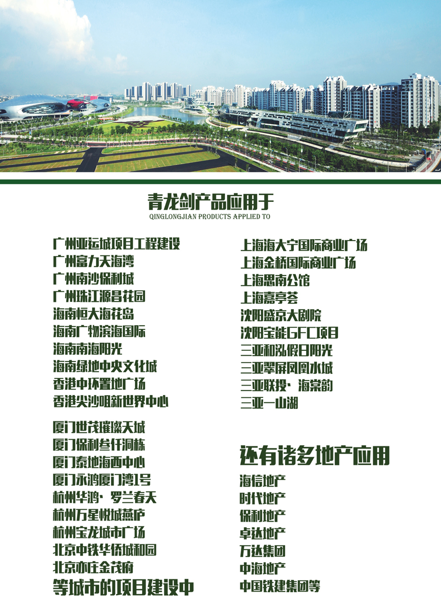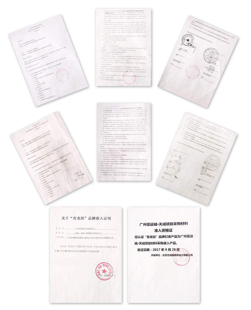 近日,收到廣州利合房地產(chǎn)發(fā)來的“青龍劍”品牌釘類產(chǎn)品在廣州亞運城項目成功入選的相關材料,青龍劍被列入工程項目中指定品牌釘類產(chǎn)品。